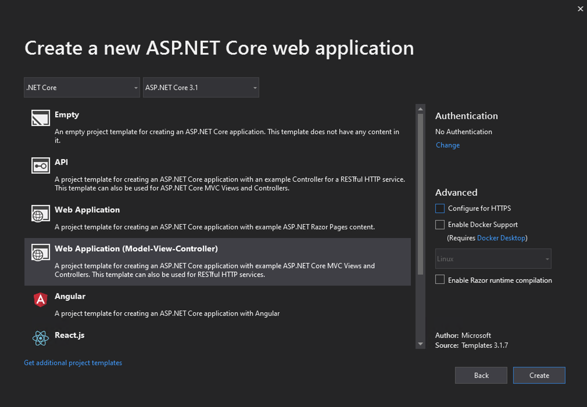 Select .NET Core from the drop-down and "Web Application (Model-View-Controller)" from the list.
